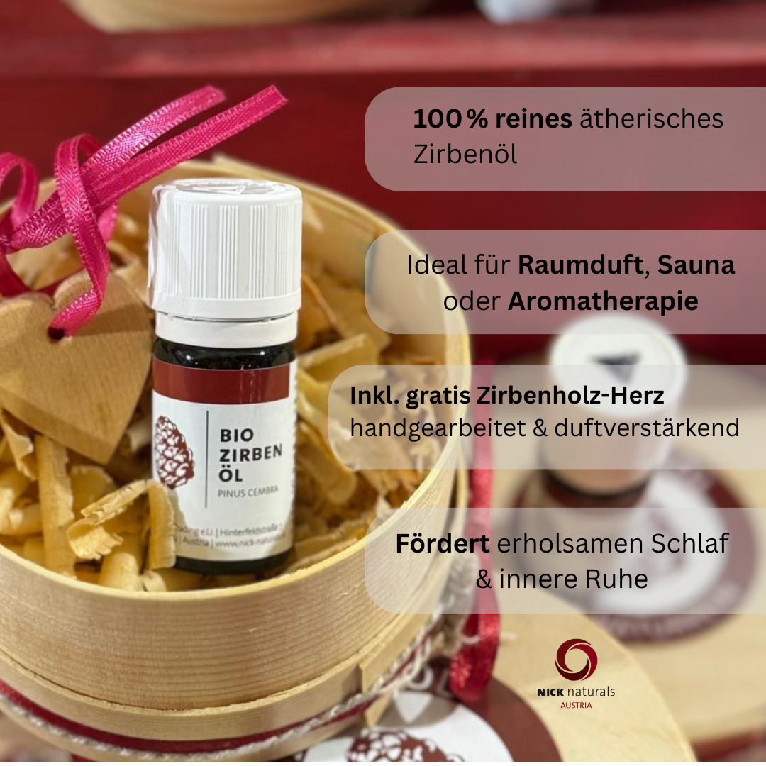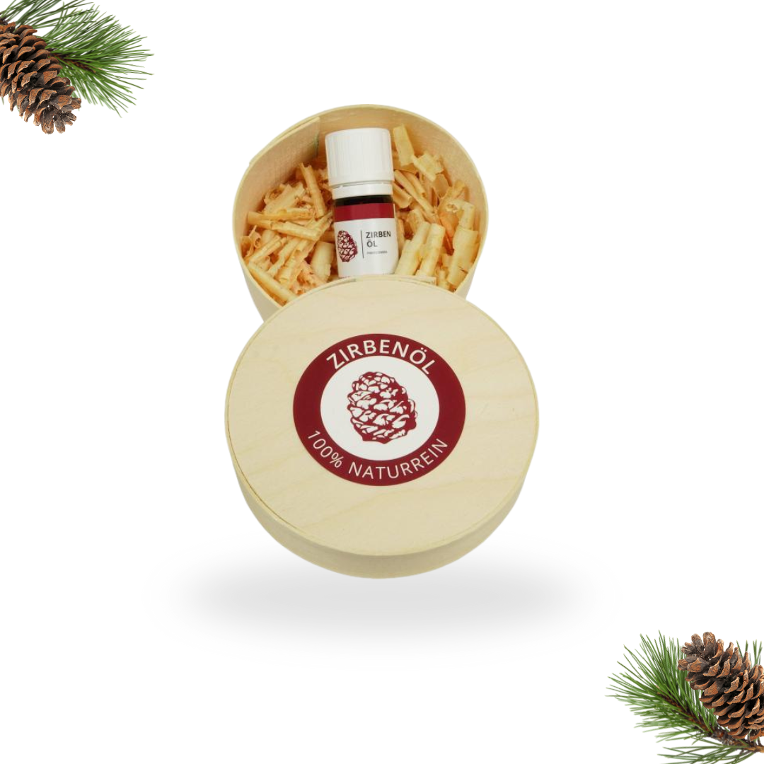 Zutaten: 100% naturreines ätherisches Zirbenöl und Zirbenspäne in einer Spanschachtel