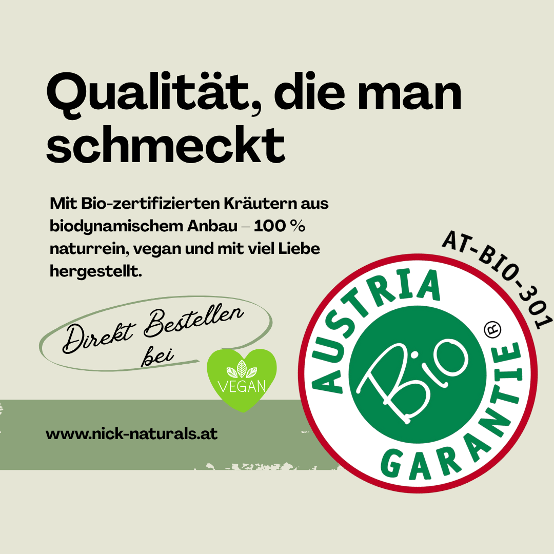 Mit viel Liebe hergestellt, aus biodynamischem Anbau und 100 % vegan. Für natürlichen Geschmack und unverfälschte Kräuteraromen – direkt von Nick Naturals.