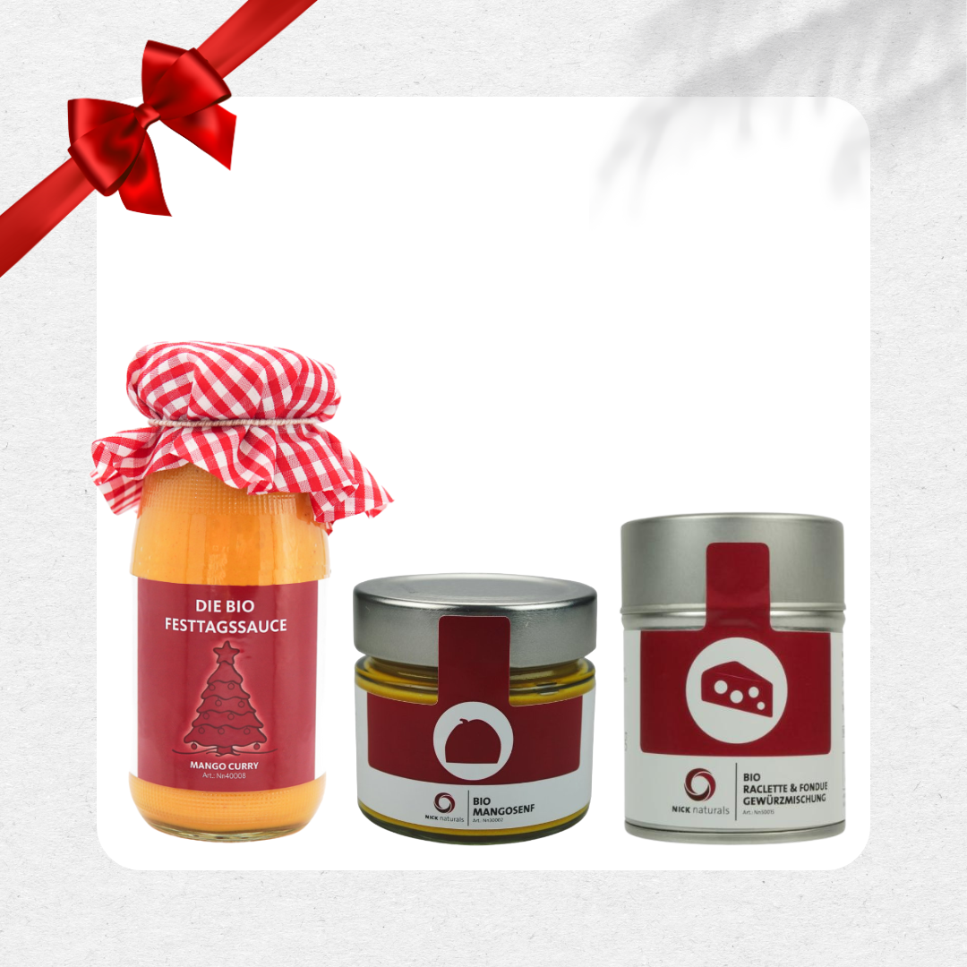 Die Bunte Mischung vereint Bio Festtagssauce, Bio Mango Senf und Bio Raclette & Fondue Gewürz – perfekt für Raclette, Fondue oder festliche Gerichte.