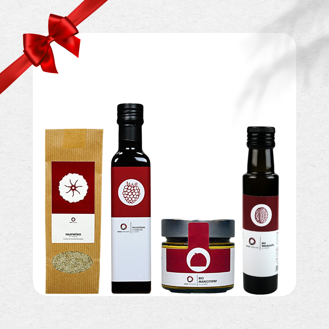 Mit dem „Easy Salad“ Geschenkeset wird jeder Salat zum Highlight! Die Kombination aus Bio Fruchtessig Himbeere, Bio Walnussöl, Bio Salatwürze und Bio Mango Senf sorgt für raffinierte Dressings und kreative Geschmacksmomente – natürlich & ausgewogen.