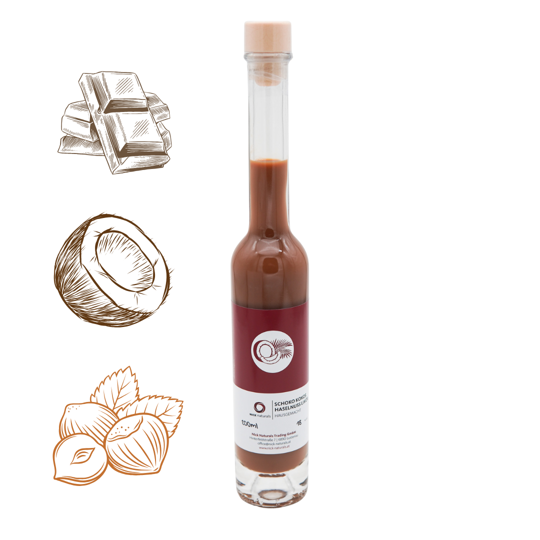 Der Schoko-Kokos-Haselnuss Likör von Nick Naturals vereint drei unwiderstehliche Aromen zu einem harmonisch-samtigen Geschmackserlebnis : vollmundige Schokolade , feine Kokosnoten und der warme, nussige Charakter gerösteter Haselnüsse .